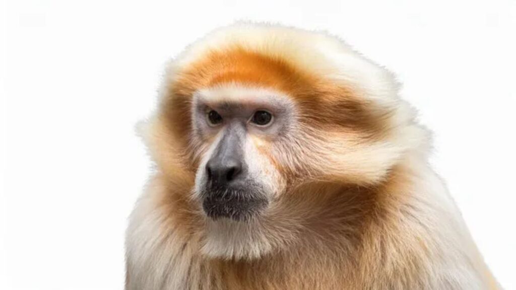 This monkey lives in the mountains of central and southwestern China. It has a blue face and lives in groups in cold forests.