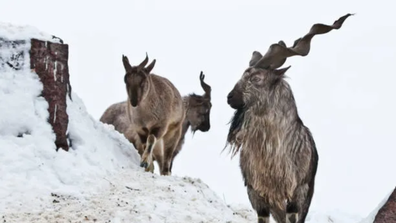 The markhor is a wild goat found in the mountains of Pakistan, Afghanistan, and India. It has twisted horns and lives in rocky areas.