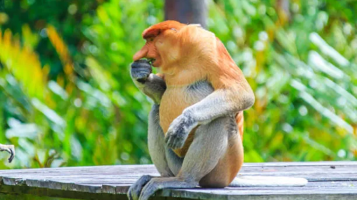 The proboscis monkey is found only on the island of Borneo in Malaysia and Indonesia. It is known for its large nose. It lives near rivers and eats leaves and fruits.
