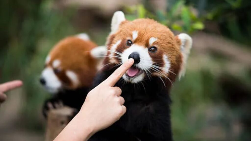 The red panda lives in the mountains of Nepal, India, Bhutan, and China. It looks like a small bear with red fur and a long tail. It mostly eats bamboo and lives in forests.
