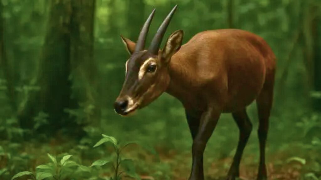 The saola is a very rare animal found in the forests of Vietnam and Laos. It looks like a deer with long horns. People rarely see it because it lives in deep forest areas.