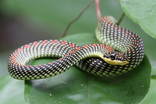 Also known as the Chrysopelea paradisi, this Southeast Asian species doesn’t just look beautiful it can glide through the air! With vivid patterns of green, black, and red, the Paradise Flying Snake uses its ribs to flatten its body and leap from tree to tree, steering through the air with surprising precision. Its vibrant scales and unique aerial ability make it one of the most fascinating and photogenic reptiles in the wild.