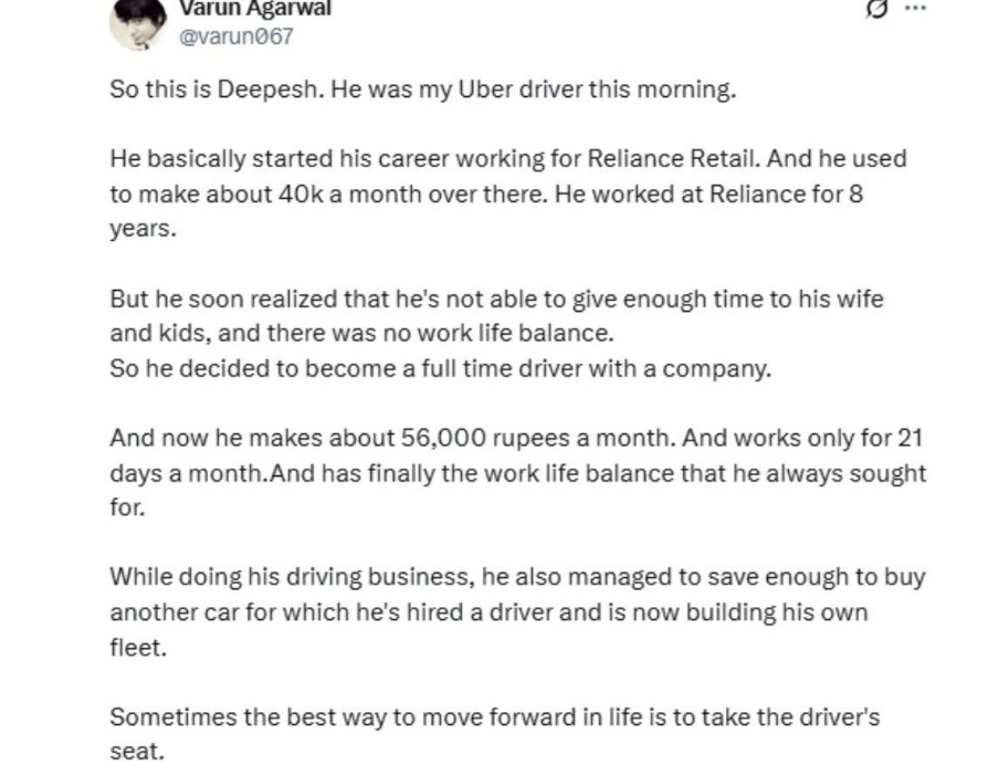 Entrepreneur Varun Agarwal shared Deepesh’s story on X, calling it a lesson in redefining success. “Sometimes the best way to move forward in life is to take the driver’s seat,” he wrote in the now-deleted post.