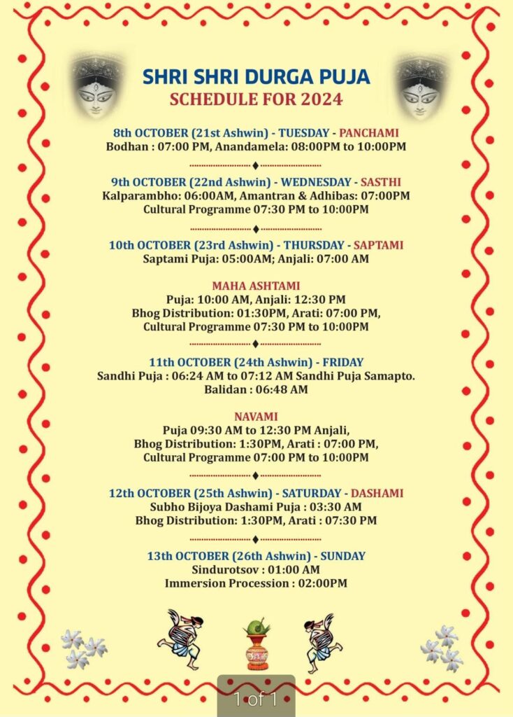 On 13th morning around 9 am we are having traditional Sindur Khela followed by Immersion. Evening we are having Bijaya Sammilani (traditional Bengali get together post immersion) for our members.