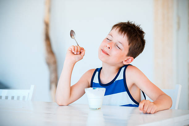 Portrait of smiling little boy eating delicious yogurt