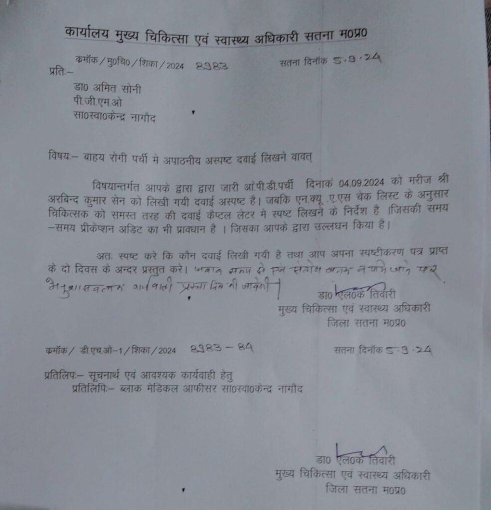 Chief Medical and Health Officer of the district, L K Tiwari, was talked to on this matter , he said, “The case of Dr. Amit Soni posted in the Civil Hospital of Nagaud has come to our notice. In which such medicine has been written in the prescription, which cannot be read by anyone.” He said, “We have issued a notice against Dr. Amit Soni on this matter and sought a reply from him. After receiving the reply, we will take action on the matter. Apart from this, the matter of running a private clinic or prescribing medicines of a private medical store is a different matter, action will be taken after investigation on this too.”