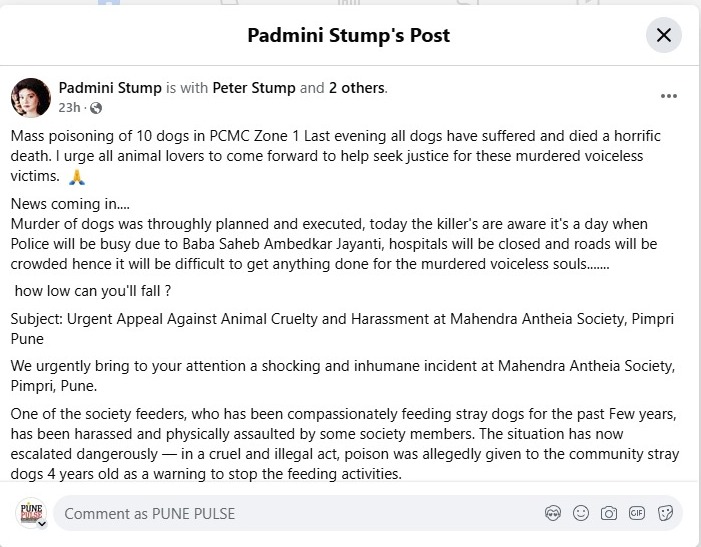 It is common in many residential societies and city neighborhoods for stray dogs to bark at night or chase two-wheeler riders, leading some residents to demand their removal. Disputes often arise between such residents and animal welfare volunteers who feed and care for stray dogs. Several such disputes have been reported to police in the past. However, the Pimpri poisoning incident has drawn strong emotional reactions and concern from animal rights activists.