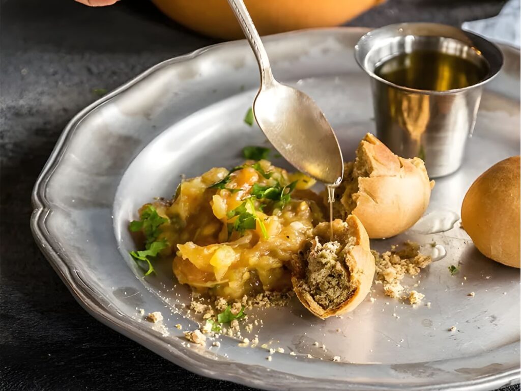 The recipe is as simple as it is soulful. First, wheat flour is kneaded into soft dough. A mix of sattu, spices, salt, and a touch of mustard oil is prepared for stuffing. Small balls of dough are filled with this mixture and roasted slowly over coal until they turn golden brown and crisp. Once cooked, they’re dipped briefly in melted ghee to soften the crust and add that rich aroma. The chokha, made by mixing roasted brinjal, tomato, and boiled potato with salt, chilli, coriander, and mustard oil, completes the dish. The first bite brings smoky, tangy, and earthy flavours that linger long after the meal ends.