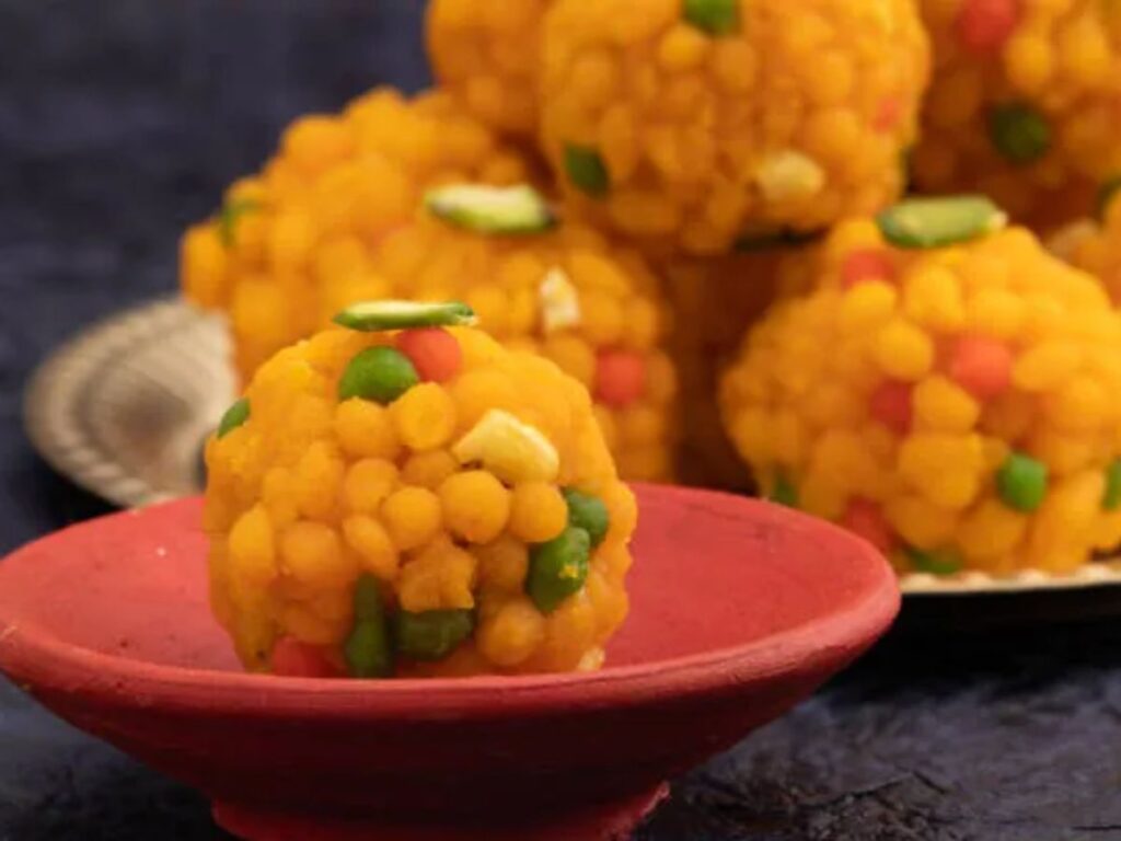 Boondi ladoo is bright, orange, and sweet. To make it, fry tiny droplets of chickpea flour batter in hot oil until golden. Soak them in sugar syrup for a few minutes, then shape them into round ladoos while still warm.