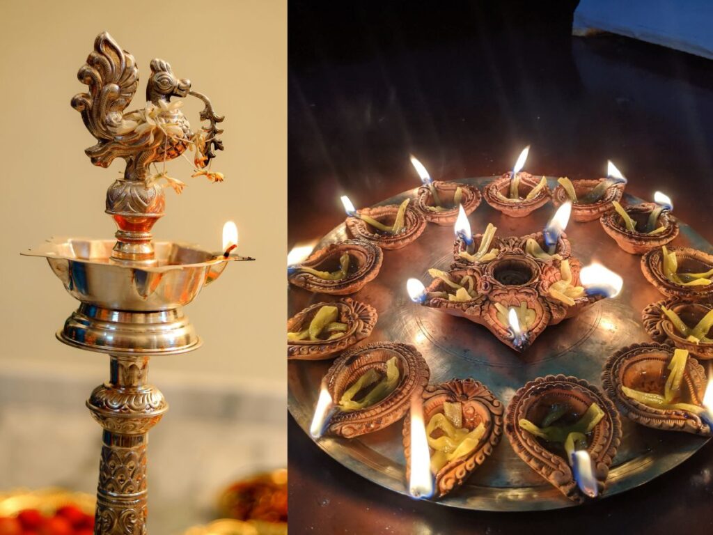 Lighting plays a big role in creating a festive mood. Diyas placed around the idol give a soft glow, while fairy lights or hanging lights can brighten up the space. Painted diyas in gold or silver tones blend easily with most themes.