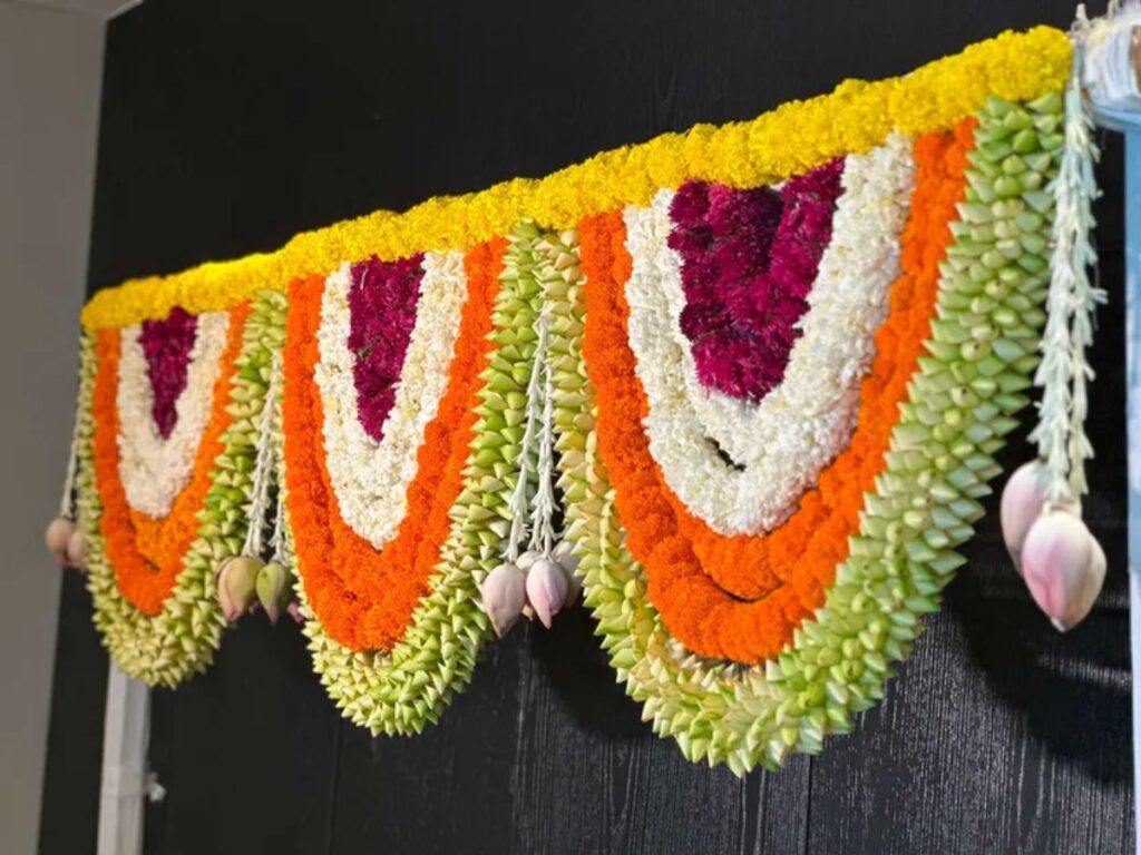 Flowers are an important part of Ganesh Chaturthi decor. Strings of marigold, jasmine, or hibiscus can be used to decorate the background, while flower malas can be placed around the idol or thali. Designs made with petals at the entrance are also a popular choice to welcome guests.