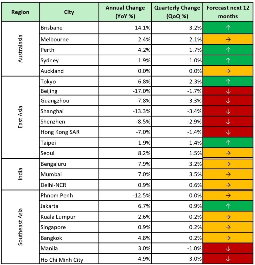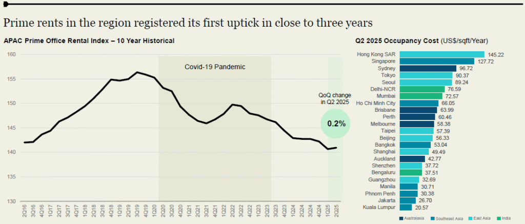 While India led the leasing momentum in Q2 2025, the broader APAC office market also showed signs of stabilization. Regional prime rents rose 0.2% quarter-on-quarter (QoQ) the first increase in nearly three years. Leasing volumes in major Indian and Australian cities offset a continued slowdown in mainland China. Rents in Brisbane grew over 14% YoY, while Tokyo recorded the region’s lowest vacancy rate amid restrained supply. Despite policy support, Chinese tier-1 markets such as Beijing and Shanghai saw rents continue to decline. Hong Kong rents have now fallen 34% since Q4 2019, positioning the city as a cost-effective base for firms seeking to tap Chinese capital markets. Overall, conditions remain cautious but not contractionary, with tenant priorities shifting toward resilience, flexibility, and functionality.