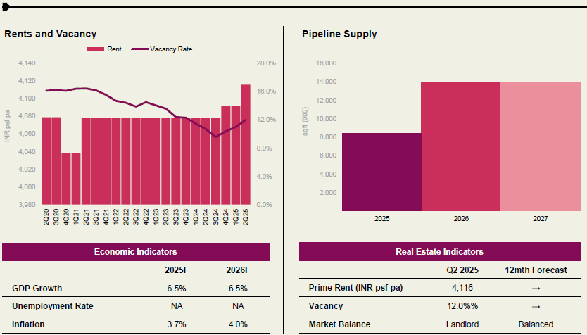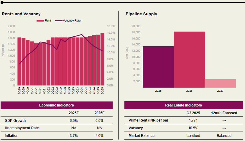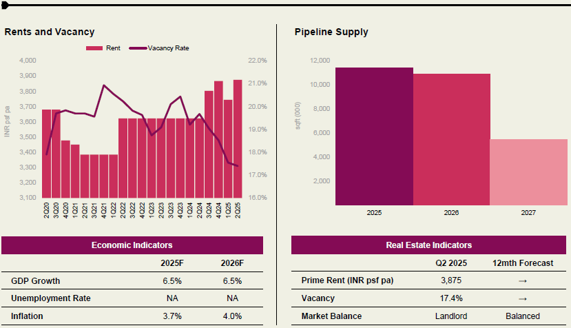 Delhi-NCR set a new benchmark in H1 2025, with total office space leased reaching 7.2 mn sq ft, the highest ever recorded for the city. Prime rents rose 0.9% YoY to INR 343 per sq ft per month. The vacancy rate stood at 12%, and rental values remained steady during the quarter. The market continues to benefit from a diverse occupier base, including third-party IT services, consultancies, and banking firms. The resurgence of tech demand, alongside stable policy frameworks, contributed to NCR’s emergence as a top-tier destination. With balanced supply and demand dynamics, Delhi-NCR’s status as a regional commercial gateway is strengthening, supported by infrastructure upgrades and strong business services presence.