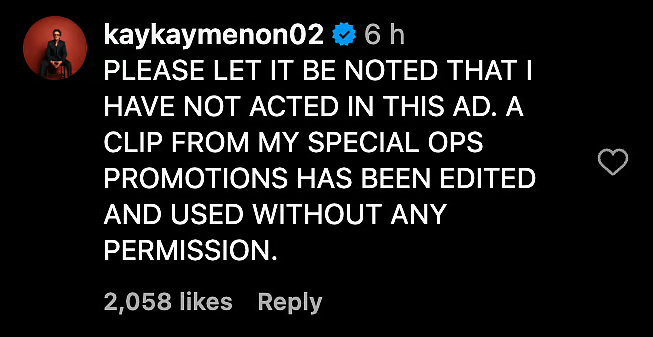 Menon addressed the issue publicly on social media, clarifying his stance and expressing displeasure. In a comment under the video, he stated, “Please let it be noted that I have not acted in this ad. A clip from my Special Ops promotions has been edited and used without permission.”