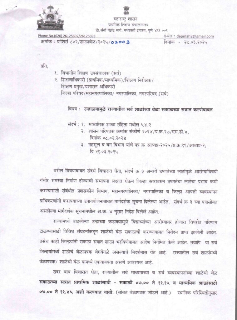 Mumbai: In response to the ongoing heatwave and its impact on students’ health, the Maharashtra government has revised school timings across the state. The School Education Department has issued new guidelines to ensure student safety and minimize health risks caused by extreme temperatures.
