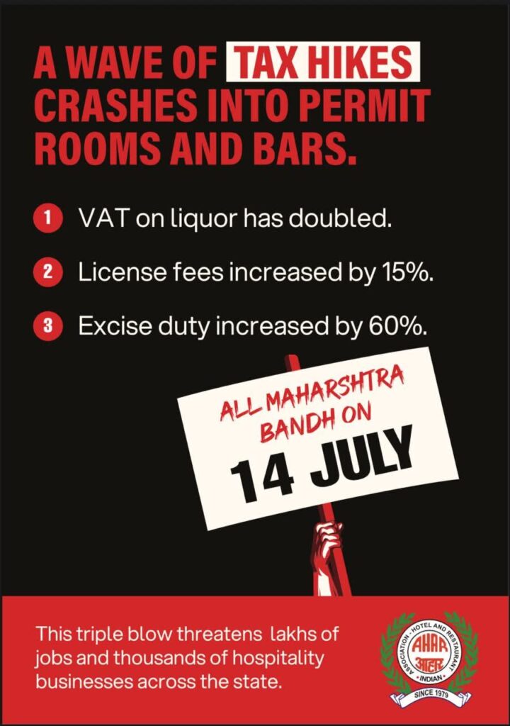 In a significant move, the Indian Hotel and Restaurant Association (AHAR) has called for a statewide bandh on Monday, July 14, in protest against the steep hike in taxes imposed on the hospitality industry. As part of the strike, all permit rooms and bars across Maharashtra are set to remain closed for the day.