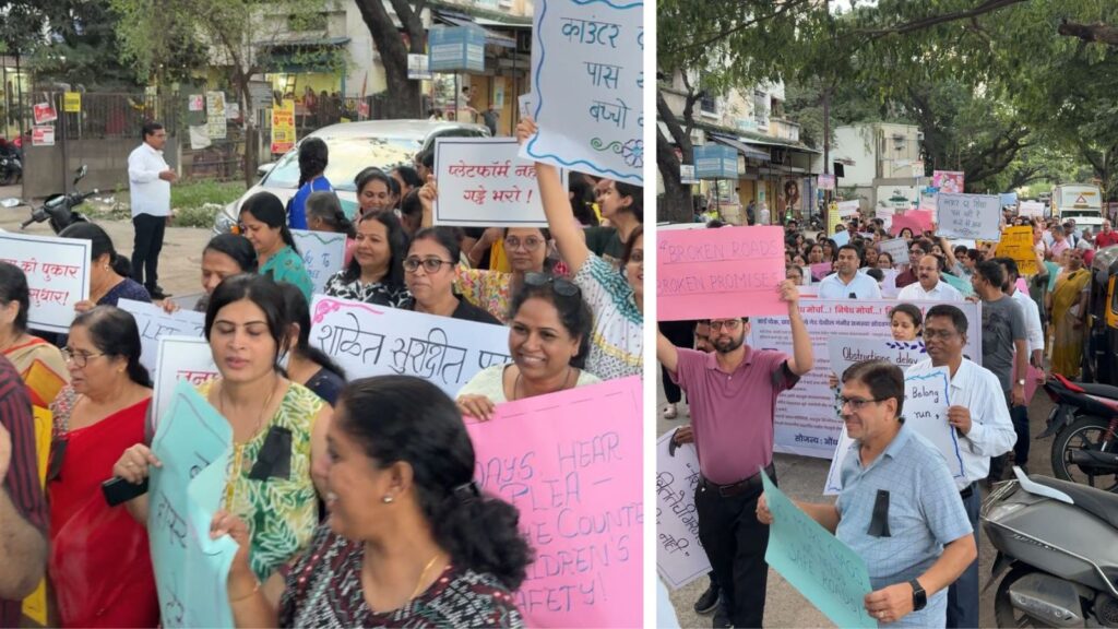 Pune, October 3, 2025: A joint peaceful protest march was held on October 3, 2025, by residents, students and staff of St. Thomas School along the Sai Mandir–Mont Vert Pristine stretch, demanding urgent action against unsafe traffic conditions, neglected roads and the growing hazards around railway gates in the neighbourhood.