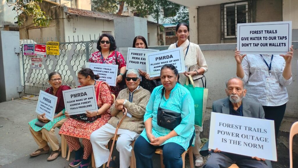 Pune, January 6, 2025 — In a striking display of unity, over 100 residents of Forest Trails, a private township developed by Paranjape Schemes Construction Ltd. (PSCL) in Bhugaon, gathered for a silent protest outside the PSCL office on Ketkar Path, Prabhat Road. Among the protesters were retired IAS officers, doctors, engineers, entrepreneurs, and residents from various professions, all voicing frustration over what they describe as the developer’s gross negligence in managing the township’s infrastructure and services.