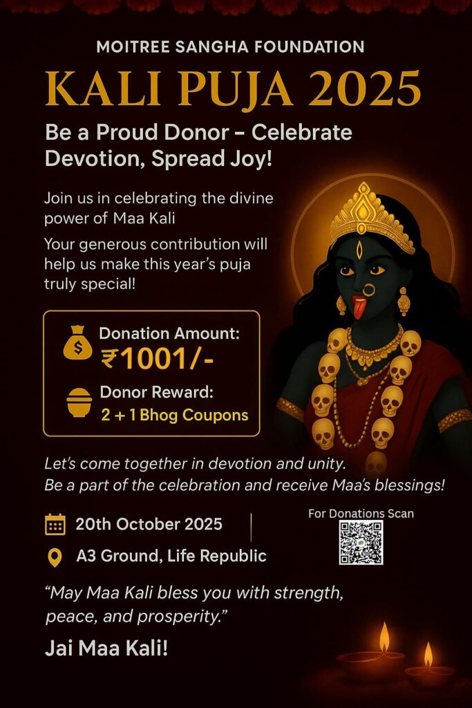 Moitree Sangha Foundation warmly invites all devotees, families, and well-wishers to join in this sacred celebration of Sarbojonin Kali Puja 2025 and experience an evening filled with devotion, unity, and blessings.