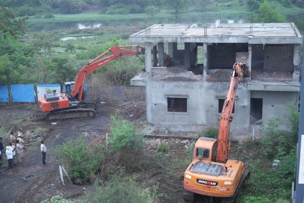 The Pimpri Chinchwad Municipal Corporation (PCMC) has carried out a major demolition drive against 36 unauthorized bungalows built along the Indrayani River within the blue flood line in Gat No. 90 of Chikhali, under the K Zone office. The action was taken today (May 17), removing illegal constructions spread over approximately 1.8 acres, covering a built-up area of around 63,970 square feet. Municipal Commissioner and Administrator Shekhar Singh inspected the site during the operation.