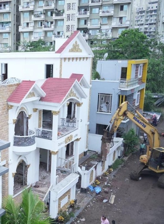 Concrete RCC structures within the river’s blue flood line pose serious threats during monsoon floods. To safeguard residents and the environment, the demolition was conducted jointly by the Building Permission Department, the Unauthorized Construction Control Unit, and the Demolition Squad.