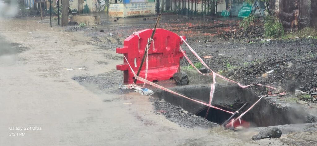 Pune, May 24 – Poor-quality drainage work recently carried out on the stretch from Handewadi Chowk to Holkarwadi and near the Royal Hotel has resulted in an accident, raising serious concerns about public safety. Shiv Sena’s Pune district head, Ulhas Tupe, has strongly criticized the administration and demanded immediate action.