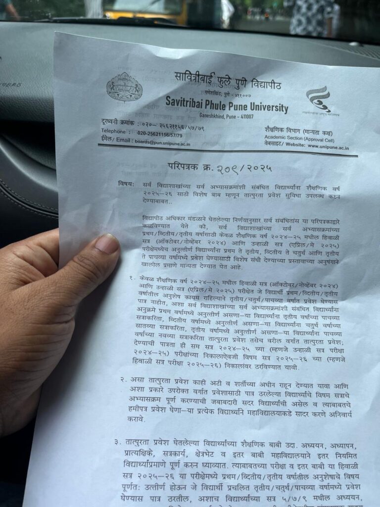 Pune: Savitribai Phule Pune University (SPPU) has announced the implementation of a special ‘Carry Forward’ policy for the academic year 2025-26, allowing students with academic backlogs to progress to the next year.