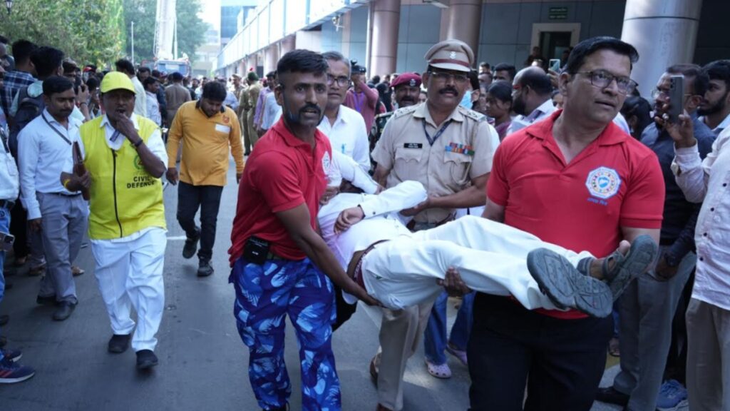 Loud explosion-like sounds echoed through the Pimpri Chinchwad Municipal Corporation’s administrative headquarters… smoke clouds spread everywhere… phones of all disaster management agencies started ringing… sirens blared across the building. A sense of panic gripped over 2,000 citizens and employees present at the premises. As people began running in fear, assuming a major disaster had occurred, emergency systems were activated. Fire brigade vehicles swiftly arrived, and all individuals inside the building were promptly evacuated. In this simulated scenario, eight men and two women were reported “injured” and were rushed via ambulances to the Yashwantrao Chavan Memorial Hospital run by the Corporation. The situation, although appearing dire, was brought under control within just 15 minutes—bringing relief to all present.