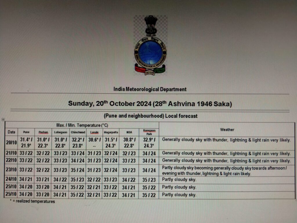Maharashtra’s unseasonal rains show no signs of abating, with steam-induced clouds causing widespread damage to crops. Despite the Southwest Monsoon’s withdrawal, the state continues to experience rainfall due to the active Northeast Monsoon and vapors from the Arabian Sea. The Pune city will experience light rainfall with lightning until October 23 after which there won’t be any rainfall but sky shall remain cloudy.