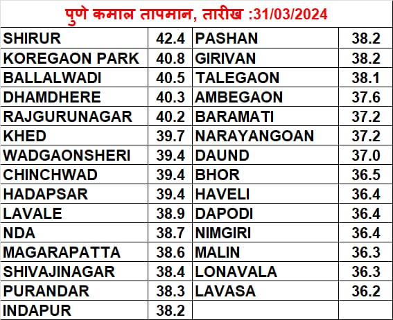 In Pune, officials from the India Meteorological Department (IMD) have forecasted that the maximum temperatures in areas monitored by their Shivajinagar and Lohegaon observatories will stay above 40 degrees Celsius (°C) until April 6. They anticipate the temperature in Lohegaon to hover around 41°C for the next few days.