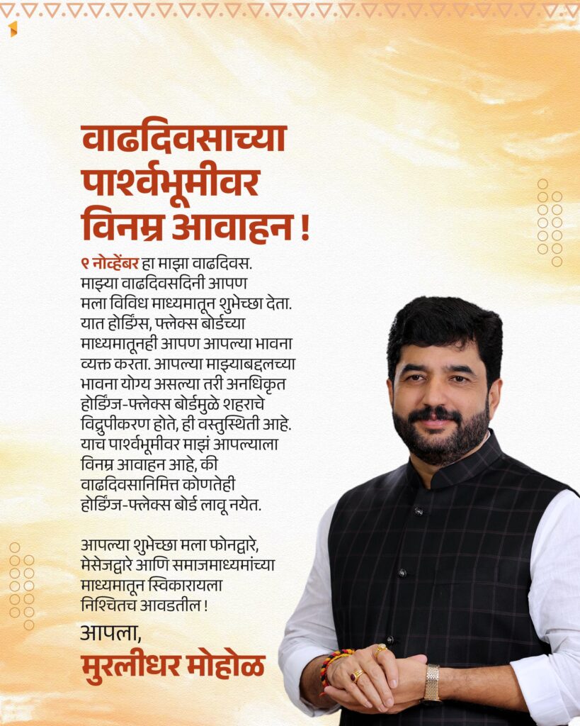 “Your wishes mean the world to me, whether they come through phone calls, messages, or social media,” Mohol stated. “While I am grateful for the sentiments behind hoardings and boards, they can disrupt the city’s appearance and cleanliness.”